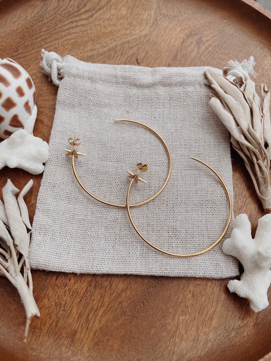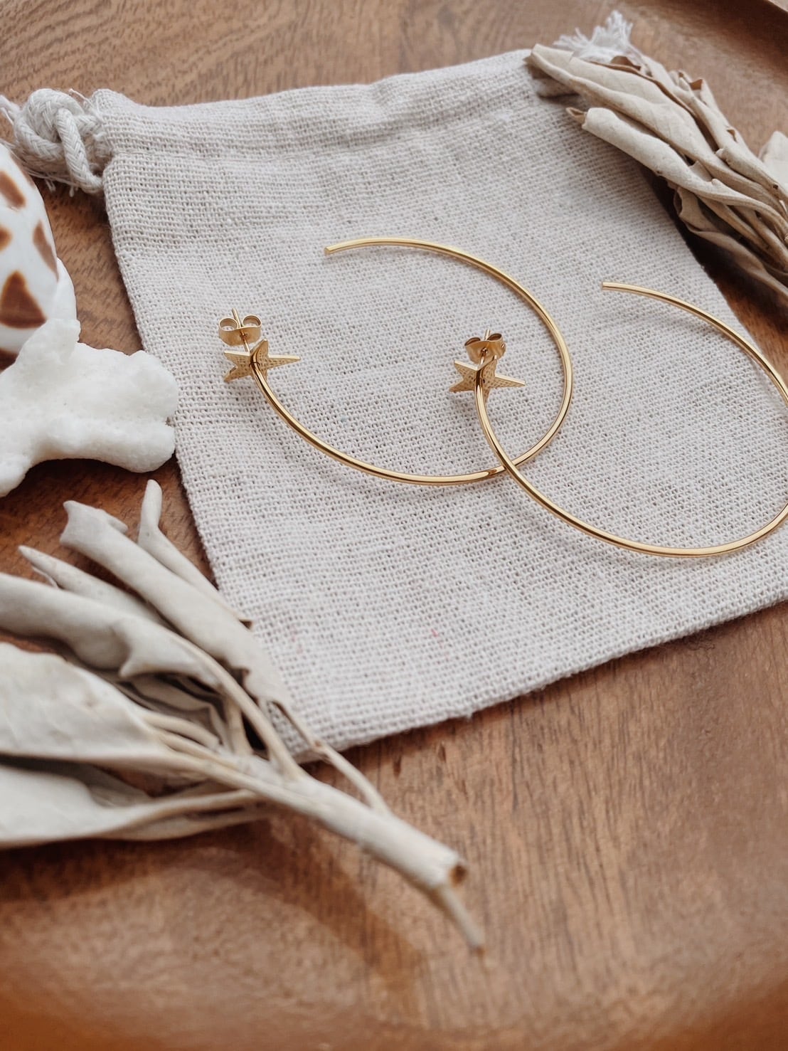 星型のフープピアスは、洗練されたデザインと存在感が際立つピアスです。大ぶりですが、とても軽く付けやすいため、デイリーユースにも最適です。ステンレス製なので、長時間の使用でも変色や傷がつきにくく、長くお使い頂けます♪