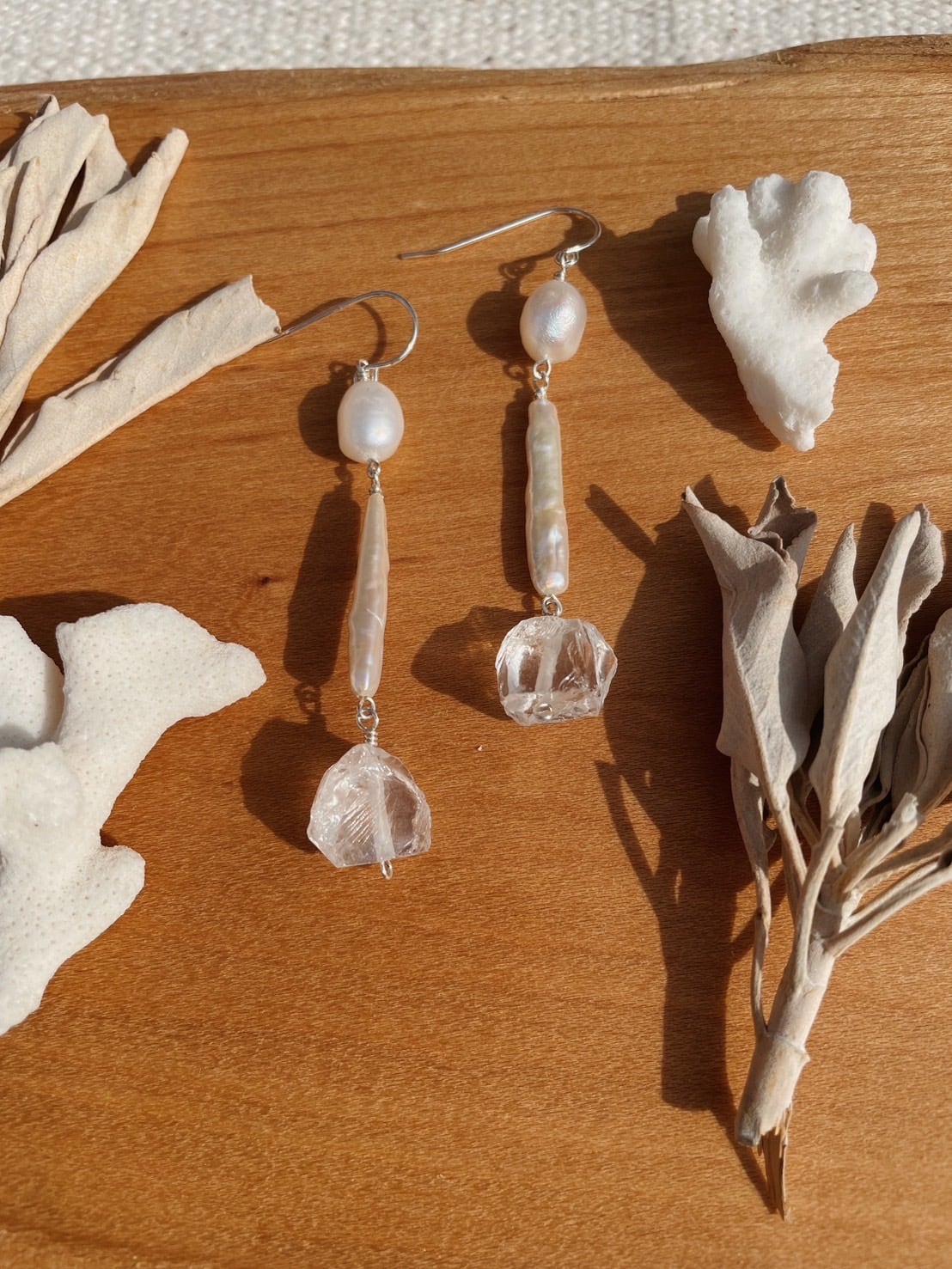 淡水パールとラフロッククリスタルクォーツを使用したslv925のロングピアスです。それぞれのピアスには自然の美しさが宿り、ユニークなデザインに仕上がっております。淡水パールは優美さと気品をもたらし、ラフロッククリスタルクォーツは、心をクリアにし、内なる真実に気づく手助けをするとされています。