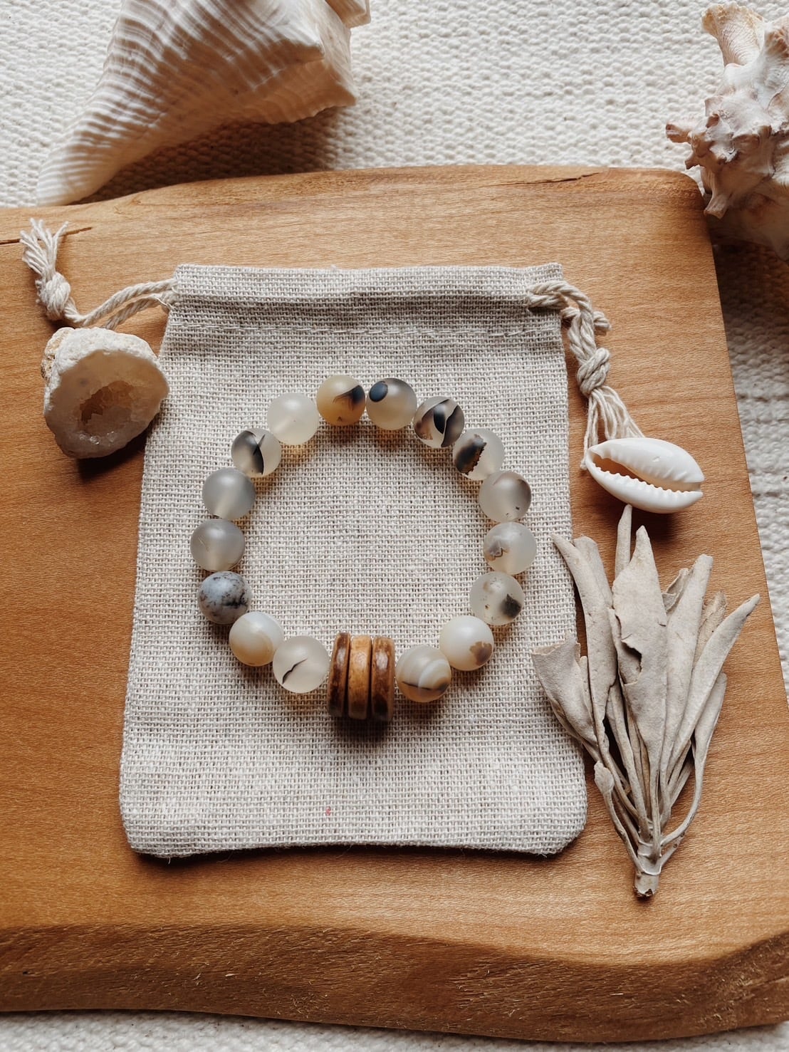 モンタナモスアゲートとウッドビーズを使用した、シンプルでありながら存在感のあるブレスレットです。自然の温もりを感じさせるウッドビーズと、神秘的な模様が特徴のモンタナモスアゲートの組み合わせが、大人の女性におすすめです。