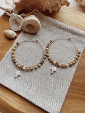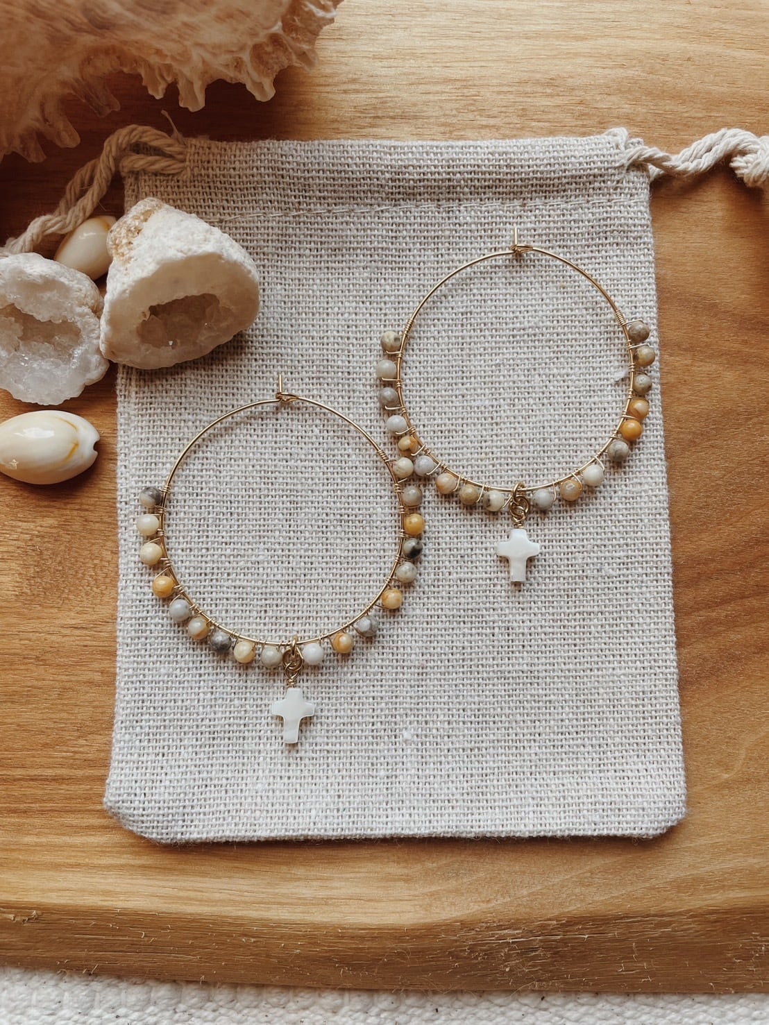 クレイジーレースアゲートとクロスチャームを用いたフープピアスです。クレイジーレースアゲートのユニークな模様が特徴で、見る人を魅了します。この石は、幸福感や活力、創造性を高めると信じられています。クロスチャームは、守護や希望の象徴として知られています。