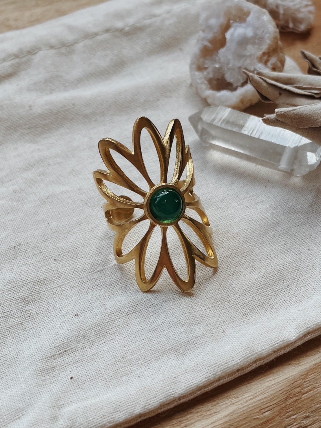 グリーンオニキスをあしらえた真鍮フラワーリングになります。